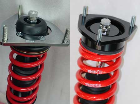 スチールアッパーマウントを採用しています。(一部車種は純正アッパーを再使用) ピロボール仕様はダイレクト感が増すものの作動音や振動が起こりやすいためにこれに匹敵する強靭なスチール材とし、専用ゴムブッシュマウントを採用しました。 また、ストラット車にはスラストベアリングを使用したマウントゴム方式の採用で異音や振動の発生を防止しており、これらはステアリング操作時のレスポンスの格段な向上と快適な乗り心地にも貢献し、独自のキャンバー調整機能(一部車種を除く)を設けています。